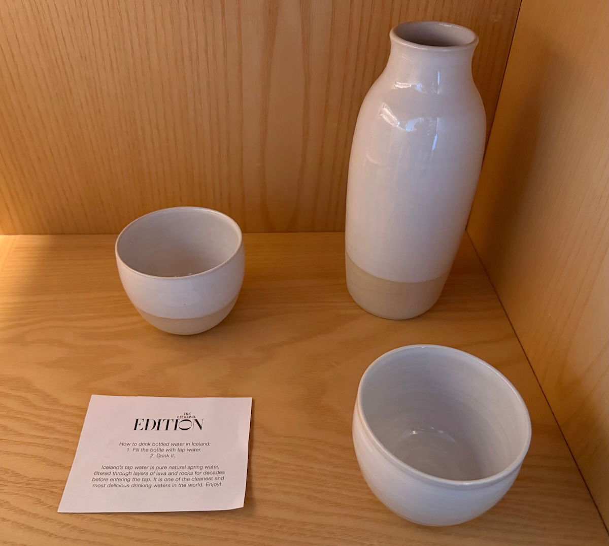 There was no bottled water in the room, but instead, there was a carafe and two small cups, with a sassy explanation about how pure drinking water is in Iceland. Cute!