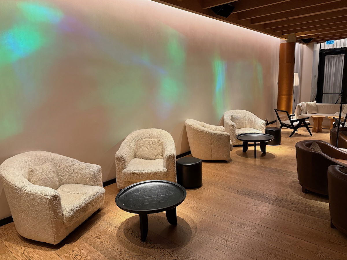 Next to the lobby is a bar area, which has a warmer vibe, with lighter colors, and even a wall with lighting that’s supposed to represent the Northern Lights.