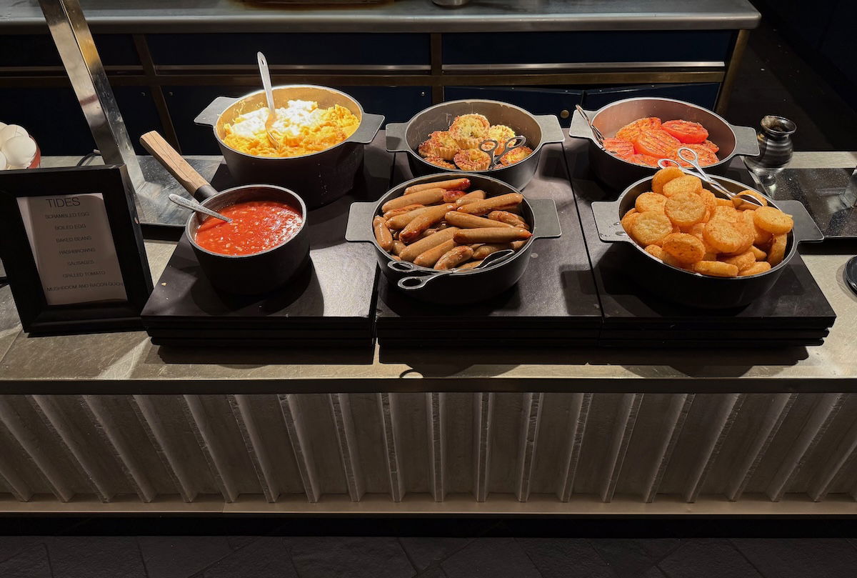 Let’s start with TIDES, the all-day dining restaurant, which serves breakfast from 7AM until 10:30AM, lunch from 12PM until 2:30PM, and dinner from 5:30PM until 10PM. The restaurant is large and quite nice, and I like the design and the views of the harbor.