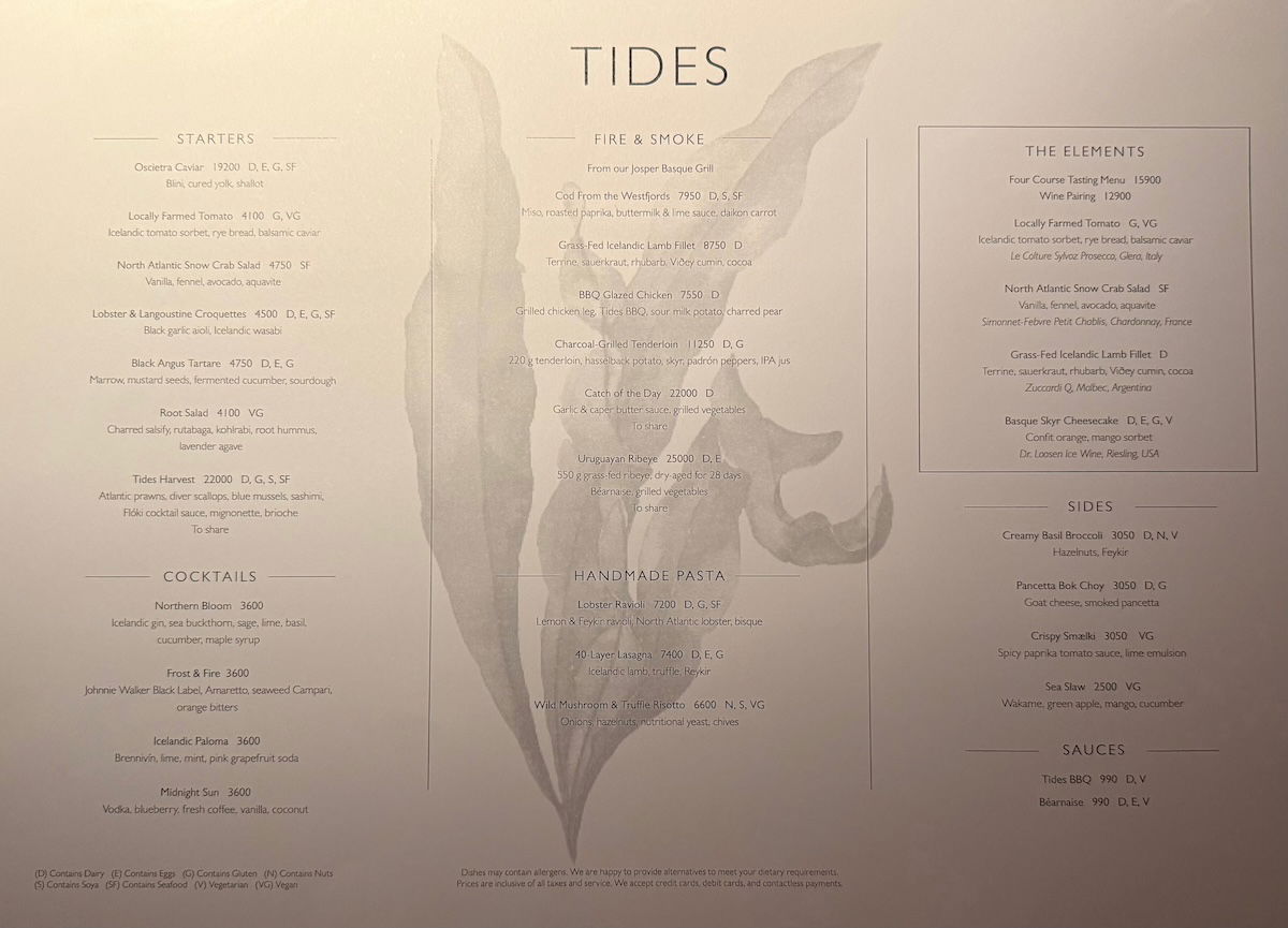 You can find the dinner menu below. The restaurant is very pricey — Iceland is expensive in general, and it almost seems like prices in the restaurant are increased to account for the destination fee credits that guests have to spend.