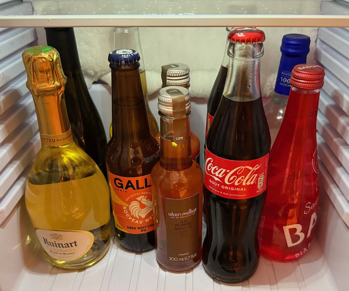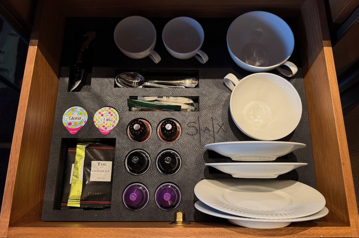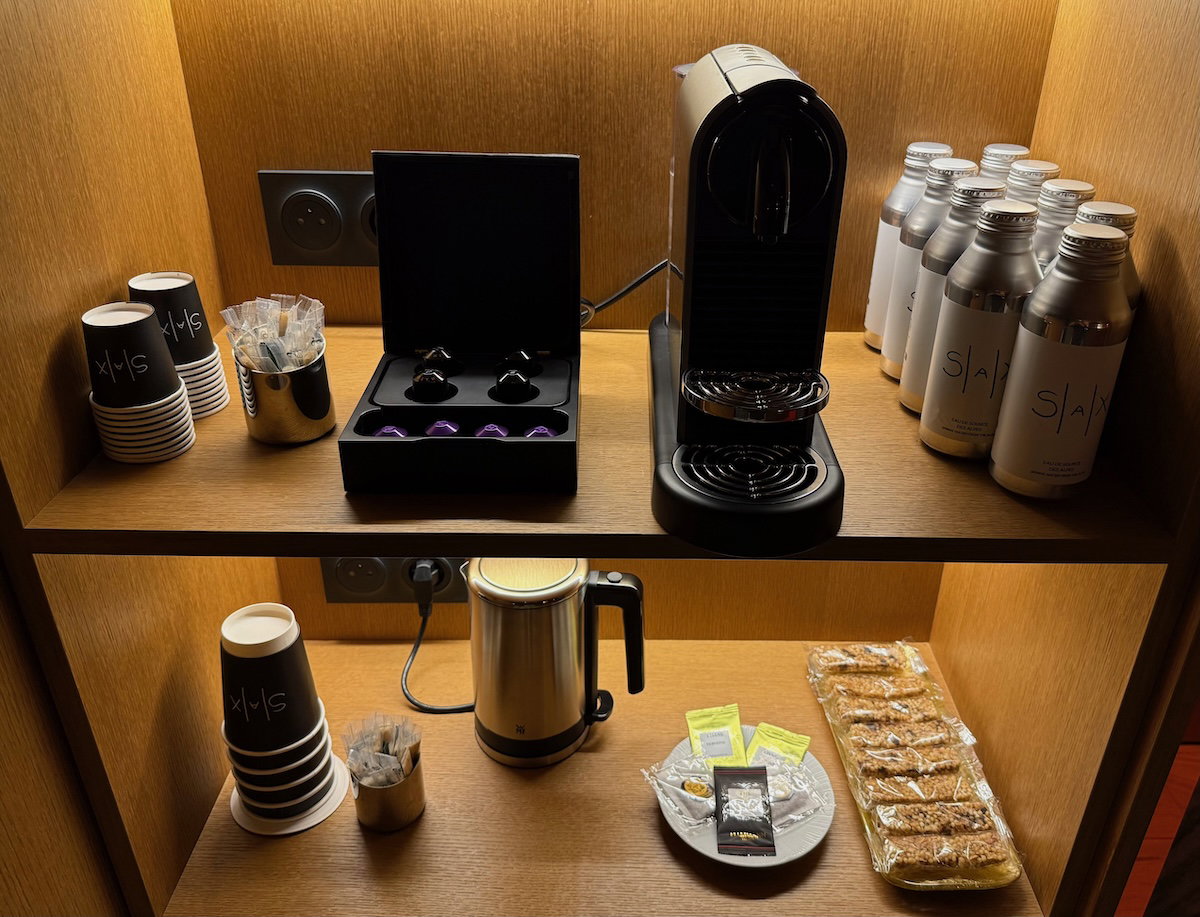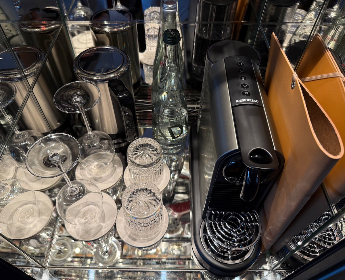 The minibar was back near the entrance, and included a Nespresso machine, a selection of tea, and a variety of drinks and snacks for purchase (the one bottle of still and sparkling water were complimentary).