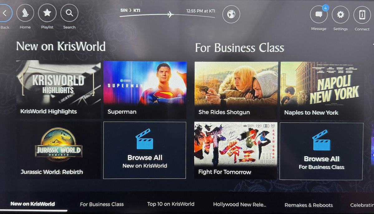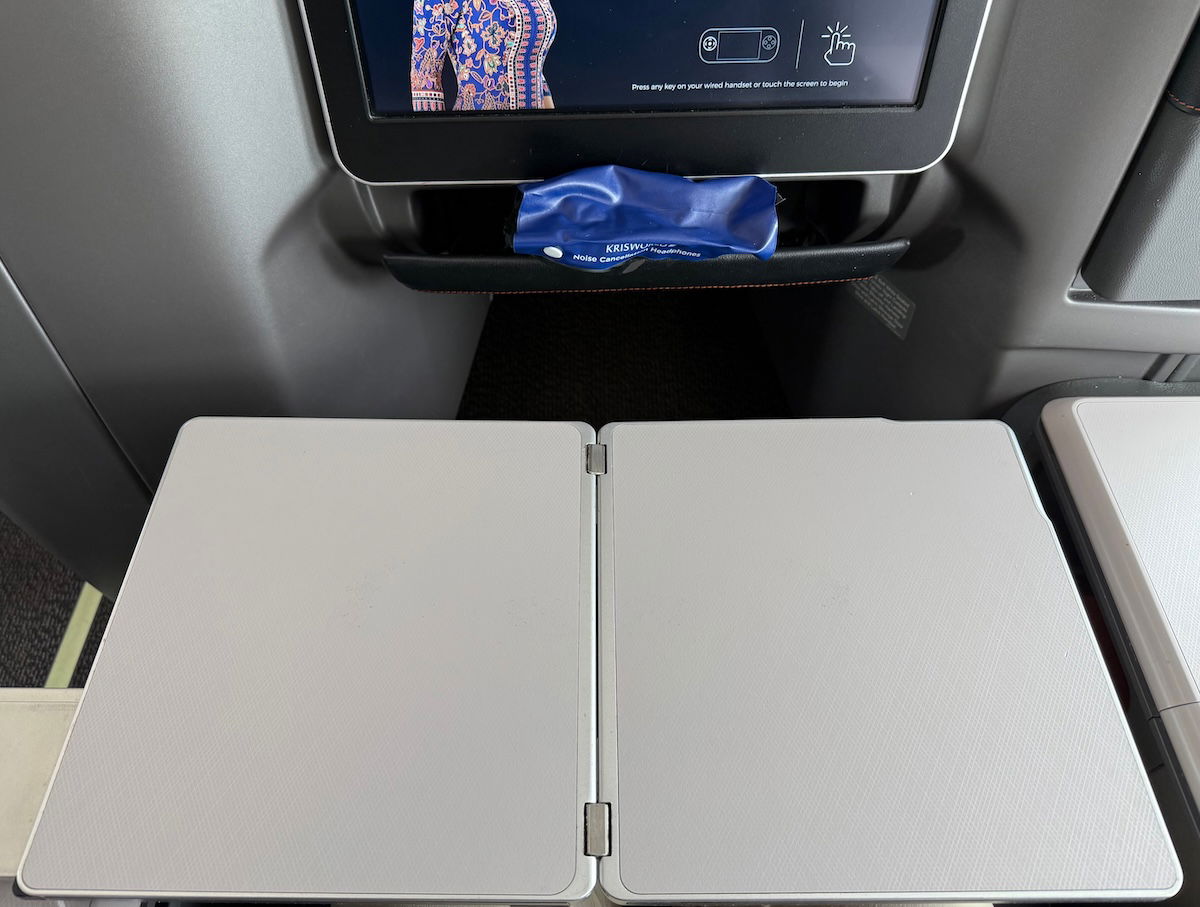 Singapore Airlines’ Boeing 737 MAX business class features the carrier’s KrisWorld entertainment system, known for being among the best in the sky. Business class seat back monitors are 16″ and are pretty high definition, though the screens do have a bit of glare, and there’s no bluetooth audio.