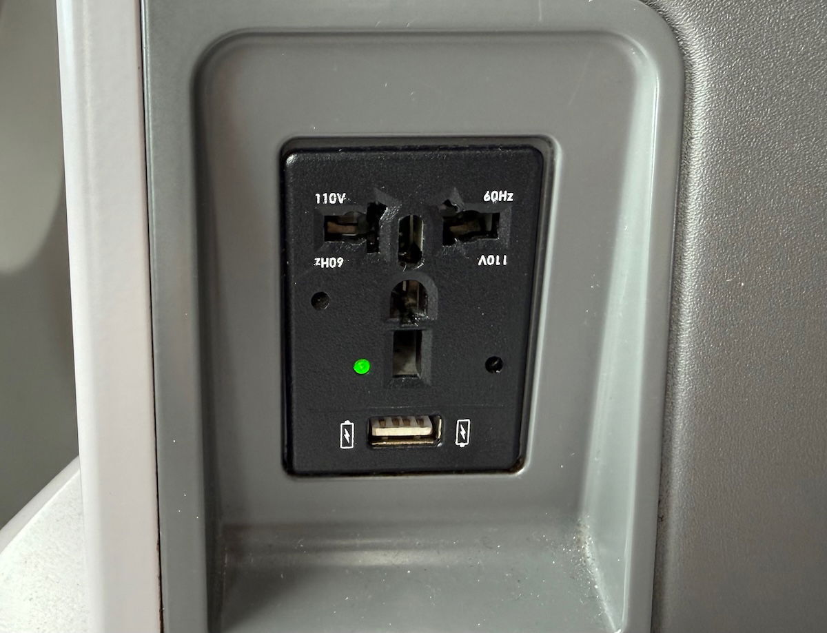 At the top of the counter space on one side is the AC power outlet, plus a second USB-A outlet. There’s no USB-C charging available at these seats.