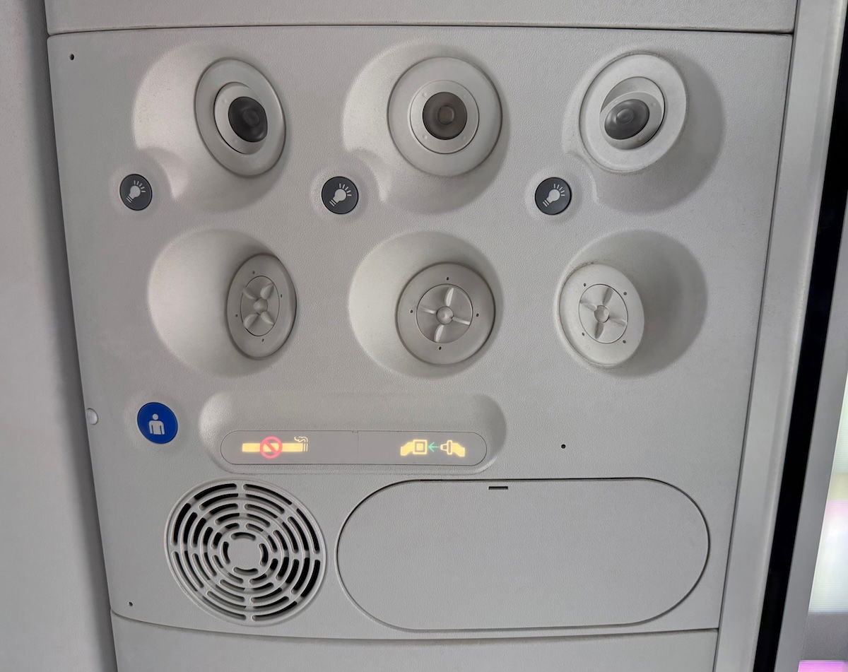 As is standard for new Boeing 737 cabins, the overhead console was modern, and there were individual air nozzles.