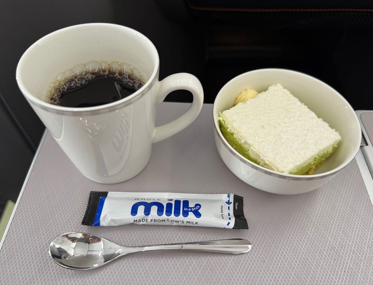 As the meal finished up, I was offered some coffee or tea. I asked for a cup of coffee, and then decided to have the dessert with that. The dessert consisted of ondeh ondeh cake, which is a pandan-flavored soft sponge cake with coconut flakes. Yum.