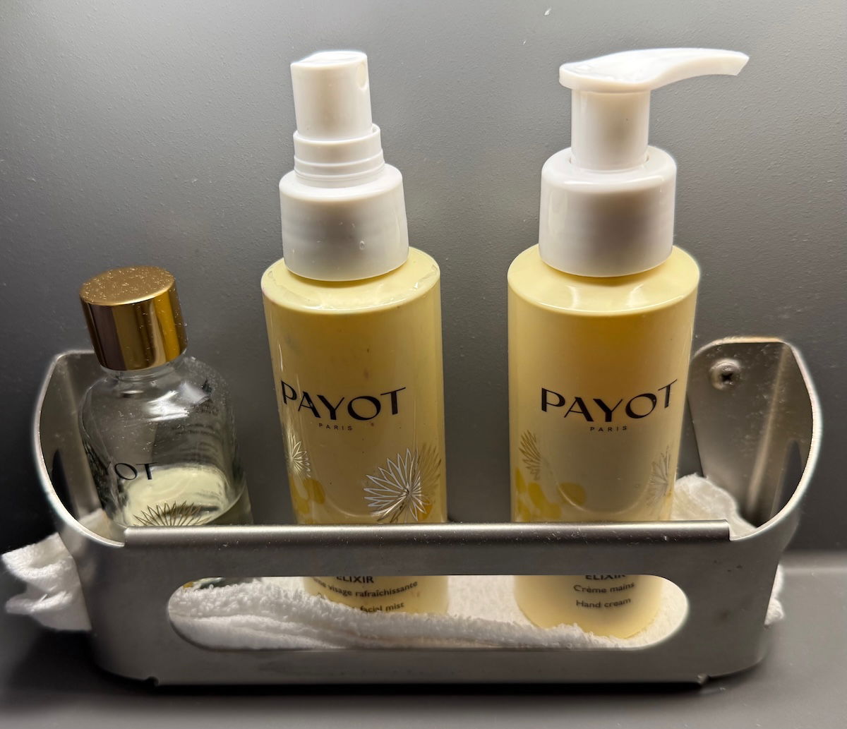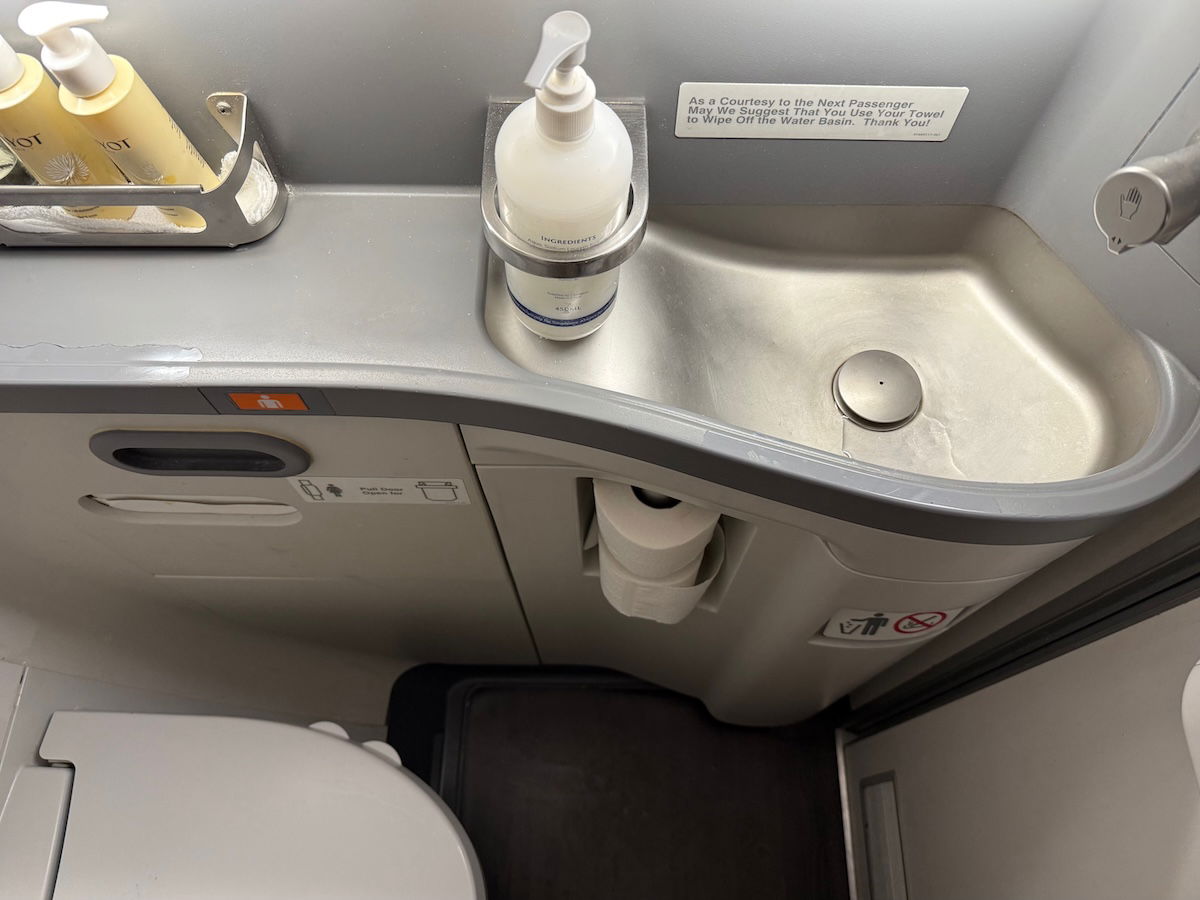 During the flight, I checked out the business class lavatory, at the front of the cabin, right behind the cockpit. As is all too common on the 737 MAX, this was one of those space saving lavatories, which was really tight. At least it was clean, and had some nice products from PAYOT.