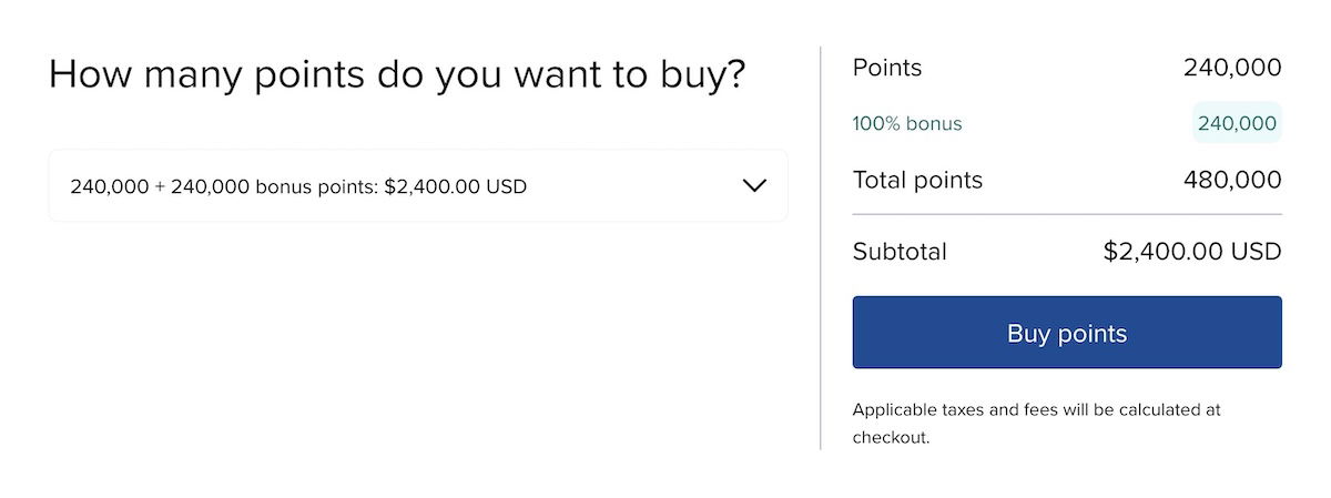 Hilton Honors ordinarily charges one cent per purchased point, including all taxes and fees. That’s before any discounts or bonuses. If you’re eligible for the 100% bonus and maxed out the offer, you’d receive a total of 480,000 points at a cost of $2,400, which is a rate of 0.5 cents per Hilton Honors point.